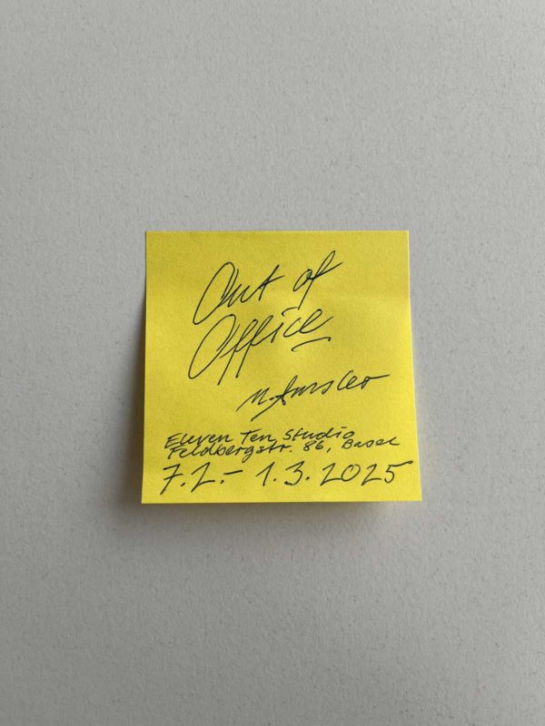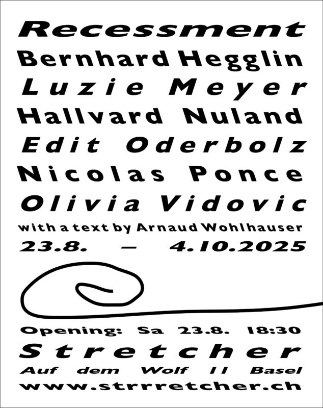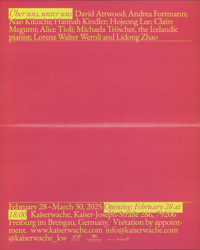 Jardins Défiants (Defiant Gardens) Halle Nord, Genf | 10.09. - 25.10.2025 Joy 12.9. - 12.10.2025 | Michael Ray-Von | Kaiserwache, Freiburg im Breisgau STRETCHER Recessment with Bernhard Hegglin, Luzie Meyer, Hallvard Nuland, Edit Oderbolz, Nicolas Ponce, Olivia Vidovic and a text by Arnaud Wohlhauser | Opening Saturday 23.8., 18:30 Tunda: The Quantic Plant and the Devil's Breath (premiere) Haus für Medienkunst Oldenburg | 2.7.-28.9.2025 THEONLYTHINGTHATISMISSING 17.7. – 9.8.2025 | A group exhibition with Jorė Gritėnaitė, Cruz Franco Nazar, Nike Nannt, Laura Piatti, Tamar Vepkhvadze. Curated by Ilja Zaharov Pilar Quinteros: Temple of Fire 17 June – 30 August 2025 | Opening Performance 17 June 2025, 1 pm, as part of Art@Dreispitz | Freilager-Platz, Campus Dreispitz, Basel/Münchenstein Schaffhauser Kulturtage 19. - 22.6.2025 | Altstadt Schaffhausen LOVE 25.4. - 26.5.2025 | Andréa Spartà | Kaiserwache Freiburg "JARA - Radioactive Patriarchy: Women of Qazaqstan" Studiokino, HGK Basel FHNW | Wed 14.05.2025, 19:00 Über uns, unter uns Kaiserwache Freiburg | Opening 28.2.2025, 18:00 Of Rabbits and Ducks Kunsthaus Langenthal | 20.2. – 22.6.2025 | Vernissage: Do 19.2. 18:00 Out Of Office Eleven Ten Studio Basel | Matthias Amsler | 7.2. – 1.3.2025 | Opening 7.2. 18:00